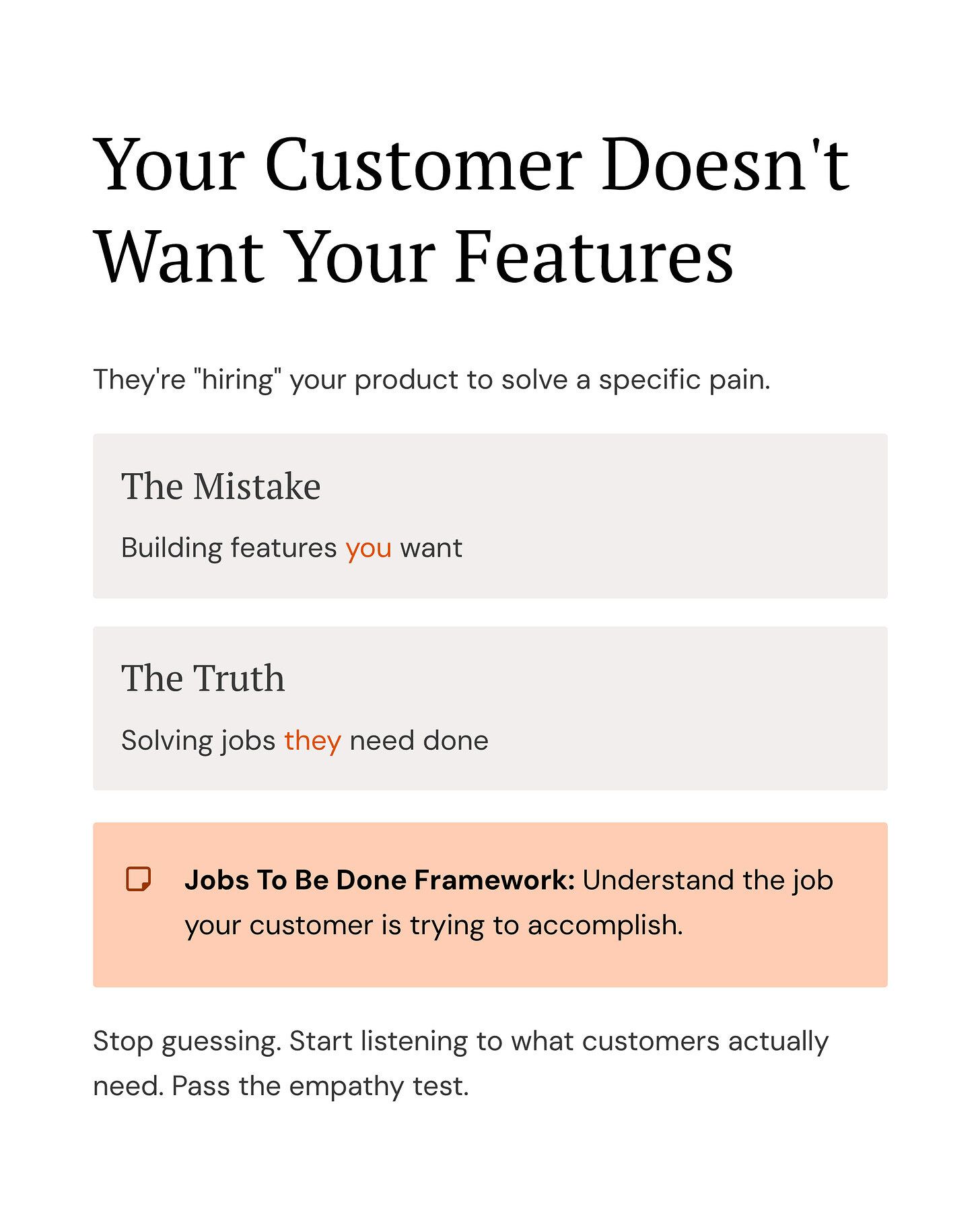 Your customer doesn’t want your features. They are “hiring” your product to solve a specific pain. Stop building features that you want.
